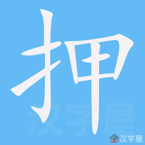 ❶把财物交给对方作为保证。多作带宾、带补谓语。 我愿先~10块钱,回头一定还你的包装箱|每个酒瓶~三角钱|我只好把这些首饰全~给他了|掌柜的只好把这批货物暂时~在郭寿亭庄上了|我先把手机放你这儿~着,等我回家拿钱再来取。 ❷拘留,扣留。可作带宾、带补谓语。 ~犯人|把他们统统~起来|先把他~下去|他们不由分说,把我给~下了|他们把小偷~到派出所去了。 ❸跟随照料,看管。可作带宾、带补谓语。 ~行李|他~了一趟车,昨天才回来|他一个人~不了那么多行李。 文书契约上的签字或代替签字的符号。有时可单用,或用作语素构成合成词。 他在契约上画了一个~|画~。 【近】 〈动〉❶抵 ❷扣 【词语】 押宝 押金 押送 押运