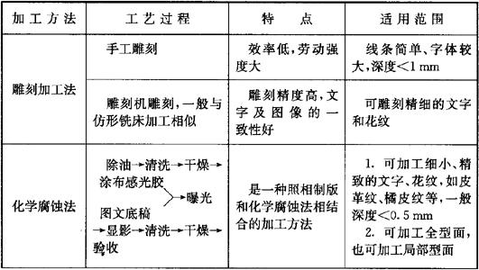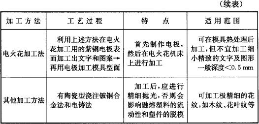 释义 | 文字、皮纹、花纹加工 (一)文字、皮纹、花纹加工工艺在模具中的应用 目前,许多产品均要求将商标、厂名、装饰性的皮纹、花纹、文字及图案直接做在产品的外表面上,以增加美感和使用效果。因此,在模具的成型零件上也相应地要加工出皮纹、花纹、文字和图案。 (二)常用的加工方法(表5.6-33) 表5.6-33 常用加工方法 |
