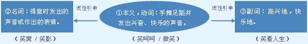 释义 | ![]() 因愉快而发出的声音或露出的表情: 眉开眼~|~口常开|观众~声不断。 哭 kū ~笑不得|痛~流涕|~着向人诉说伤心事。 啼 tí 悲~|~笑皆非|你别这样哭哭~~的。 泣 qì ~不成声|喜极而~|可歌可~。 ❶露出愉快的表情,发出欢喜的声音。能重叠。 a.作谓语,可带补语,可构成连动词组作谓语。 小宝~了|孩子们高兴地~着、跳着|你怎么不~~?|他~得开心极了|奶奶~得合不拢嘴|他~在脸上,喜在心头|他~出了声来|青年们~着跑了过来。 b.作“喜欢”等动词的宾语。 她从小就喜欢~。 c.作定语。 他~的模样可爱极了。 ❷讥笑。用于口语。 a.作带宾、带补谓语,宾语可以是非名词性词语。 他什么也不懂,大伙别~他|人们~我太傻|大家别~他没能耐|小伙子被~得怪难为情的|为这蠢事,同志们~了我好几天|你自己把事办糟了,怎么反倒~起我来? b.构成词组作宾语。 她最怕别人~|他总担心背后有人~。 【反】 ❶哭 【词语】 笑柄 笑哈哈 笑剧 笑里藏刀 笑貌 笑眯眯 笑面虎 笑谈 笑嘻嘻 笑颜 笑靥 笑吟吟 笑语 笑逐颜开 字源解说 夭,既是声旁也是形旁,表示扭动身体,挥臂起舞。笑,籀文 ![]() ![]() ![]() ![]() ![]() ![]() ![]() ![]() ![]() ![]() ![]() ![]() ![]() ![]() ![]() ![]() ![]() 附 白话版《说文解字》:笑,此字在《说文解字》中本来没有,是后来附上的。【注】臣铉等人案语:孙愐在《唐韵》中引用《说文》说:“笑,喜悦时发出的声音。字形采用‘竹、犬’会义。”然而孙只引用,并未阐述“笑”的会义的道理。现在俗体字都采用“竹、犬”会义。又臣铉等人又案语:李阳冰刊定的《说文》中,“笑”的字形采用“竹、夭”会义,并解释说:当竹林遇风,竹身会夭屈像人发笑的时候一样。但不知这样的解释是否合理可靠。 引申线索 ![]() 【字族索引】 夭 【同音字】 xiào |