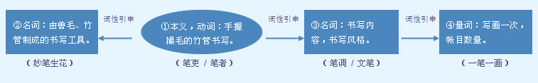 释义 | ![]() 写字画图的用具。 a.作主语。 这支~很好写|~从他手中掉下来了。 b.作宾语。 买了两支~|用~写字|用~简练。 c.作定语,常带“的”, ~的种类很多|~的发展历史很长。 表示款项、书画艺术、文字结构等的量。常构成数量词组作句子成分。 a.作定语。 存了一~钱|他写得一~好字|马良又画了几~风|这~血债一定要叫他们加倍偿还。 b.作补语,不用“得”。 对李自成的功绩应大书一~|尤其是这南方的吊钟,我觉得应该着重地提它一~。 c.作宾语。 “长”字只有四~|你多写了一~。 d.构成数量词组作状语。 字要一~一~地写|这个字是一~写成的。 【词语】 笔触 笔答 笔底下 笔调 笔端 笔伐 笔法 笔锋 笔杆子 笔耕 笔供 笔画 笔会 笔迹 笔记 笔架 笔尖 笔力 笔录 笔路 笔名 笔势 笔试 笔受 笔顺 笔算 笔谈 笔套 笔筒 笔头儿 笔误 笔下生花 笔意 笔译 字源解说 “聿”是“筆”的本字。聿,甲骨文字形 ![]() ![]() ![]() ![]() ![]() ![]() ![]() ![]() ![]() ![]() ![]() ![]() ![]() 附 文言版《説文解字》:筆,秦謂之筆。从聿,从竹。 附 白话版《说文解字》:笔,秦国称之为“笔”。字形采用“聿、竹”会义。 引申线索 【字族索引】 毛 【同音字】 bǐ |