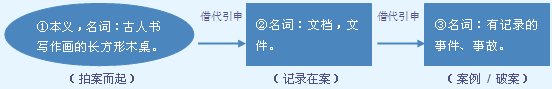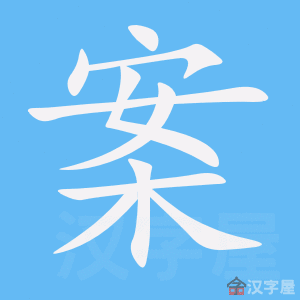 字源解说 安,既是声旁也是形旁,表示稳定。案,篆文 = (安,定)+ (木,桌),表示宽矮稳定的桌子。造字本义:宽矮稳定的长方形木桌,通常用于书写作画。古代窄小的桌叫“几”,宽矮的叫“案”,高立的叫“桌”。 附 文言版《説文解字》: 案,几屬。从木,安聲。 附 白话版《说文解字》: 案,几类的家俱。字形采用“木”作边旁,“安”是声旁。 引申线索