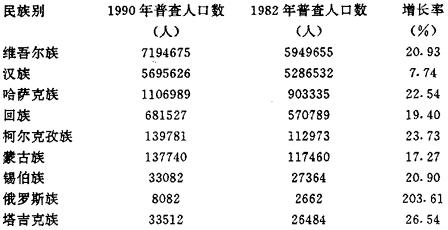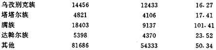 1990年11月18日 新疆维吾尔自治区1990年第4次人口普查手工汇总16个地、州、市共有47个民族。现将13个主要民族人口数及其增长率公布如下:   我区百万人口以上的民族有3个,他们是:维吾尔族、汉族和哈萨克族;人口低于100万高于10万的民族有3个,他们是回族、柯尔克孜族、蒙古族。 在13个民族中,与1982年人口普查数据相比,增长率在20%以上的有8个,他们是俄罗斯族、满族、塔吉克族、柯尔克孜族、达斡尔族、哈萨克族、维吾尔族和锡伯族;其中:俄罗斯族和满族的增长率超过1倍以上,增长率低于20%的有汉族、乌孜别克族、蒙古族、塔塔尔族和回族,其中:汉族的增长率最低,只有7.74%。 |