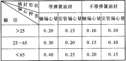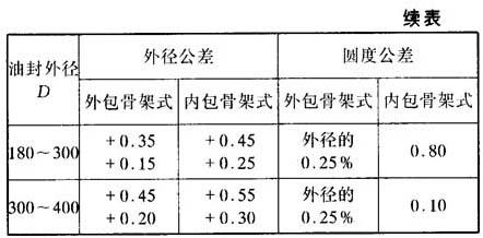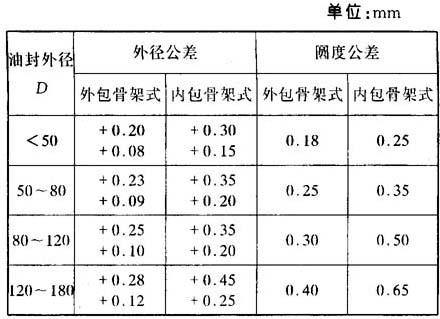 释义 | 旋转轴的设计要求 ·应保证油封唇缘对旋转轴的过盈量要求,其值如表26.5-4所示。 表26.5-4 油封唇对轴的过盈量 ·为保证密封效果,油封的外径和圆度公差见表26.5-5(a)。 表26.5-5(a) 油封外径公差及圆度公差 ·油封在使用过程中的最大偏心量也应严加控制,以确保密封效果,其范围如表26.5-5(b)所示。 表26.5-5(b) 油封最大允许偏心量 单位:mm ·旋转轴的表面硬度,一般取HRC30~40。当油封基体材料的表面,即其密封副滑移的表面,粘贴有聚四氟乙烯树脂,成为复合结构时,或者在橡胶基体材料的表层,作浸氟或等离子喷氟处理时,轴的表面硬度应取HRC50~60。 |