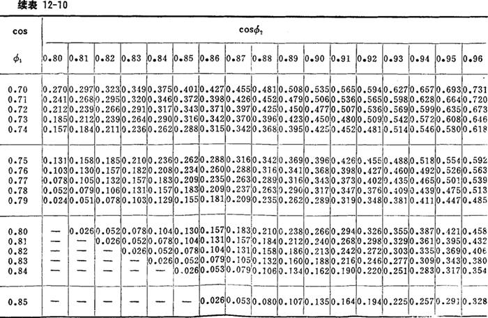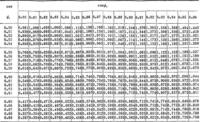1.提高功率因数的意义和方法 糖厂由于采用大量感应电动机及变压器等用电设备,因此供电系统除供给有功功率外还需供给大量无功功率,这样使发、配电设备的能力不能充分利用,当功率因数偏低时,将造成发电机的输出功率、效率降低,成本提高,供电能力降低,网路电力损耗增加,线路电压损失增大,使用电设备运行条件恶化等。 根据水电部《供用电规则》规定,高压供电保证力率在0.9以上,其他保持在0.85以上,经过努力达不到以上规定者,应装必要的补偿设备。 补偿方法:糖厂一般采用静电电容器补偿根据技术经济计算结果,可设置在高压或低压侧。 2.静电电容器补偿容量的计算 静电电容器的补偿容量可按下式确定: Qc=α (tanΦ1-tanΦ2) (千乏) Qc=αPtsqc (千乏) 式中 P1s——全厂(车间)的有功计算负荷(千瓦) α——全厂(车间)平均负荷系数,一般取0.7~0.8 tanΦ1,tanΦ2——补偿前后均权功率因数角的正切值 qc——补偿率(千乏/千瓦)按表12-10查出 表12-10 补偿率qc值   查表时cosφ2值按电力部门的要求,cosφ1可采用最大负荷时的数值。 |