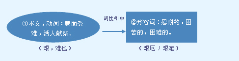 字源解说 艰,甲骨文 = (人,献身者)+ (壴,击鼓祭祀),表示远古时代当气候或环境出现极限恶劣状况、大量夺去人的生命时,先民用活人献祭,以求消除天灾。有的甲骨文 用“女” 代替“人” ,表示用女子献祭。有的甲骨文 = (壴,击鼓祭祀)+ (口,呐喊)+ (田,像头套、面套)+ (大,人,受难献祭者),表示让献祭者蒙面受难。造字本义:蒙面受难,活人献祭。金文 误将甲骨文字形中的“壴” (鼓)写成“喜” ;误将甲骨文字形中的 写成“黄” 加“火” 的复杂字形 。籀文 又误将金文字形中的 写成 。篆文 用 (恨)代替籀文的“喜” ,表示受难者怒目而视。隶书 将篆文的 写成“艮” 。俗体楷书 用代表某种复杂的动作的“又” 代替正体楷书 的“堇” 。 附 文言版《説文解字》:艱,土難治也。从堇艮聲。囏,籒文艱从喜。 附 白话版《说文解字》:艰,土地坚硬,难于耕作管理。字形采用“堇”作边旁,“艮”作声旁。“囏”,籒文的“艱”采用“喜”作边旁。 引申线索