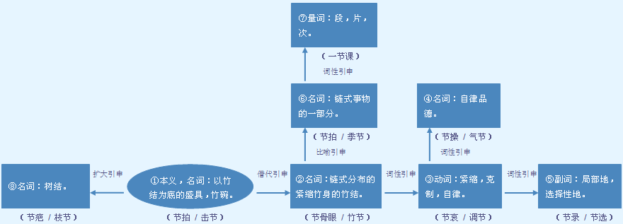 释义 | ![]() (節) 节日、节气。常带上定语后充当相应的成分。 a.作动词“过”的宾语。 孩子们欢天喜地地过了一个很热闹的~。 b.作主语。 中国的每一个~几乎都有来历。 c.构成方位词组作状语。 ~前没有时间了,这些问题~后再解决吧! d.用作语素构成合成词。 国庆~|~气。 用于分段的物体或文章。常构成数量词组充当相应的成分。 a.作定语。 14~车厢|两~香肠|三~课。 b.作主语。 第二章第一~是重点。 c.作宾语。 那甘蔗太硬,他只吃了一~。 节省、限制。不能重叠。很少单用,常用于固定词组中。 ~电|~煤~|水|~油|开源~流|~衣缩食。 【词语】 节哀 节本 节操 节度使 节俭 节减 节理 节烈 节令 节流 节录 节律 节略 节目 节能 节拍 节气 节日 节食 节外生枝 节衣缩食 节余 节育 节肢动物 字源解说 节,金文 ![]() ![]() ![]() ![]() ![]() ![]() ![]() ![]() ![]() ![]() ![]() 附 文言版《説文解字》:節,竹約也。从竹,即聲。 附 白话版《说文解字》:节,竹结。字形采用“竹”作边旁,“即”是声旁。 引申线索 ![]() 【字族索引】 节 【同音字】 jiē jié |