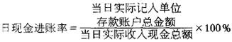 银行出纳部门每天收存的现金总数与实际记入单位存款账户总金额的比例。进账率越高,资金周转就越快。日现金进账率的计算公式为: