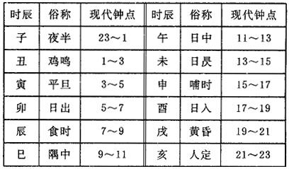 古代计时单位。一昼夜分为12个时辰,每一时辰合现在的2小时,以十二地支为名。每一时辰又分为2个小时辰,每个小时辰即现在的1小时。十二时辰的俗称,以及与现代钟点的对应关系,见下表: