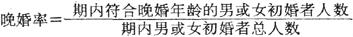 释义 | 晚婚率 指一定时期内符合晚婚标准的男或女初婚者人数占男或女初婚者总数的比重。 计算公式为: 由于晚婚率指标是指初婚者符合晚婚标准的程度,因此要包括未办结婚登记手续而实际已结婚的初婚者,但不包括再婚和复婚者。晚婚对人口再生产有一定影响。 |