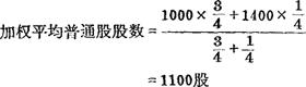 该股数是以流通时间为权数进行加权计算的普通股股数,一般用于计算每股收益。如果公司某年前9个月有1000股普通股票流通,而其后增资400股,使最后一季度流通股票为1400股,则: