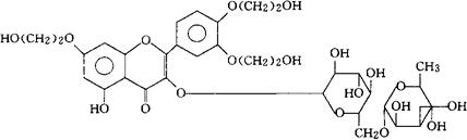 释义 | 曲克芦丁 C33H42O19=742.68 CAS-7085-55-4 2-[3,4-双(2-羟乙氧基)苯基]-3-[[6-O-(6-去氧-α-L-吡喃甘露糖基)-β-L-吡喃葡糖基]氧]-5-羟-7-(2-羟乙氧基)-4H-1-苯并吡喃-4-酮。 2-[3,4-bis(2-Hydroxyethoxy)phenyl]-3-[[6-O(6-deoxy-α-L-mannopyranosyl)-β-D-glucopyranosyl]oxy]-5-hydroxy-7-(2-hydroxyethoxy)-4H-1-benzopyran-4--one. 3,5-二羟-3′,4′,7-三个(2-羟乙氧基)-3-[6-O-(6-去氧-α-L-吡喃甘露糖基)-β-D-吡喃葡糖苷]黄酮。 3,5-Dihydroxy-3′,4′,7-tris(2-hydroxyethoxy)-3-[6-O-(6-deoxy-α-L-mannopyranosyl)-β-D-glycopyranoside]flavone. 3′,4′,7-三(羟乙基)-芦丁。 3′,4′,7-Tris(hydroxyethyl)rutin. 毛细血管保护药。 用于静脉疾患(如痔)。 维生素P4。 Troxerutin,Vitamin P4,Z6000,THR,Posoyutin,Ruven,Veinamitol. INN,BAN,DCF,USAN,MI. |