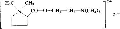 C12H26I2N2O2=484.16 CAS-1018-34-4 碘化2-羧-1,1-二甲基吡咯烷鎓与碘化(2-羟乙基)三甲基铵的酯。 2-Carboxy-1,1-dimethylpyrrolidinium iodide ester with(2-hydroxyethyl)trimethylammonium iodide. 1,1-二甲基-2-[[2-(三甲氨基)乙氧]羰基]吡咯烷鎓(2+)二碘化物。 1,1-Dimethyl-2-[[2-(trimethylammonio)ethoxy]carbonyl]pyrrolidinium(2+)diiodide. 神经节阻断药。 Trepirium Iodide,Hygronium,LLI. INN,USAN.  |