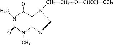 C11H13Cl3N4O4=371.61 CAS-17243-70-8 3,7-二氢-1,3-二甲基-7,2-(2,2,2-三氯-1-羟基乙氧)-乙基-1H-嘌呤-2,6-二酮。 3,7-Dihydro-1,3-dimethyl-7,2-(2,2,2-trichloro-1-hydroxyethoxy)ethyl-1H-purine-2,6-dione. 7-[2-(2,2,2-三氯-1-羟基乙氧)乙基]茶碱。 7-[2-(2,2,2-Trichloro-1-hydroxyethoxy)ethyl]theophylline. 平喘药。 Triclofylline. INN,DCF,USAN.  |