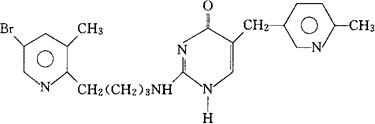 C21H24BrN5O=442.36 CAS-86181-42-2 2-[[4-(5-溴-3-甲基-2-吡啶基)丁基]氨基]-5-[(6-甲基-2-吡啶基)甲基]-4(1H)-嘧啶酮。 4(1H)Pyrimidinone,2-[[4-(5-bromo-3-methyl-2-pyridinyl)butyl]amino]-5-[(6-methyl-2-pyridinyl)methyl]-. 2-[[4-(5-溴-3-甲基-2-吡啶基)丁基]氨基]-5-[(6-甲基-3-吡啶基)甲基]-4(1H)-嘧啶酮。 2-[[4-(5-Bromo-3-methyl-2-pyridyl)butyl]amino]-5-[(6-methyl-3-pyridyl)methyl]-4(1H)pyrimidinone. 抗组胺药,组胺H1A-受体拮抗药。 Temelastine,SK&F93944. INN,BAN,USAN.  |