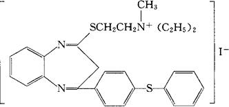 C28H32IN3S2=601.61 CAS-54663-47-7 二乙甲基2-[4-[对-(苯硫基)苯基]-3H-1,5-苯并二氮杂 -2-硫基]乙基铵的碘化物。 Diethylmethyl[2-[4-[p-(phenylthio)phenyl]-3H-1,5-benzo diazepin-2-ylthio]ethylammonium iodide. 2-[β-(N-二乙基氨基)乙硫基]-4(对-苯硫基)苯基-3H-1,5-苯并二氮杂 -甲碘化物。 2-[β-(N-Diethylamino)ethylthio]-4-(p-phenylthio)-phenyl-3H-1,5-benzodiazepine-methiodide. 抗感染药。 Antoral,Tibezonium Iodide,Thiabenzazonium Iodide.REC-15/0691. INN,DCTT,USAN,MT.  |