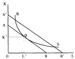 当等成本线和等产量线相切时厂商所购买的投入物的组合。 以两种投入物为例,如附图所示,图中横轴代表劳动投入量,纵轴代表资本投入量。AB线和A′B′线分别代表两条不同成本水平的等成本线。曲线RQS是一条代表一定产出水平的等产量曲线。如果厂商生产的产量就是等产量曲线所代表的那种产量水平,那么它可以通过劳动和资本的无数种不同的组合来获得这一产量,如R,Q,S三个不同组合点。 但是,为了以最低的成本生产出这一产量,厂商将会在无数个组合点中选择一个最优的组合点Q。Q点与等产量曲线上其他任何一点相比所处的等成本线最低。 Q点是等产量曲线与等成本线的切点。  Q点上等成本线和等产量曲线的斜率相等,满足厂商选择两种投入物的最优组合的条件是:MPL/PL=MPK/PK 式中的MPL和MPK分别代表劳动和资本的边际产量,PL和PK分别代表劳动和资本的价格。 这个公式的经济含义是:当每种生产要素的边际产量和价格都成比例时,厂商所购买的投入物组合能获得最大利润。 |