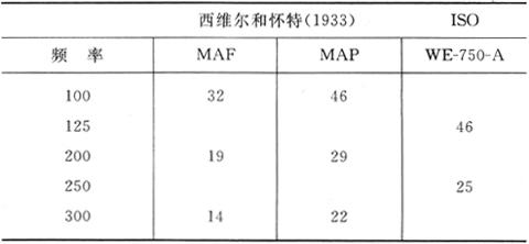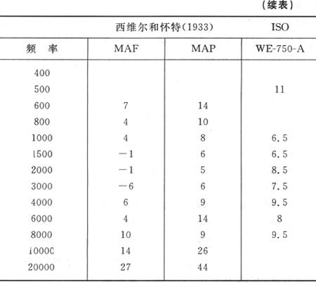 听觉指标。 人在无回音室中的最低听觉阈限。美国贝尔实验室的西维尔和怀特1933年提出。 测量方法:在无反射、无驻波的无回音室中,让被试站在一声源前,主试发出不同频率的纯音,并在将各种频率的纯音强度调整到被试有50%可能觉察时,让被试离开,在同样的条件下测量测验时被试头部所处空间的声压强度。另一种方法是最小可听压法,即让被试戴上耳机在普通实验室进行测验。 其结果见表。由表可见,两种方法的结果存在一些差异。 西维尔和怀特推测,原因可能是最小可听压测验时被试所戴耳机产生噪声所致,这种噪声由被试的一些生理因素引起,如心脏跳动等。此后有人对耳机内的噪声水平测定发现,耳机可产生低频噪声,而提高了频率为1000赫兹附近信号的绝对阈限。根据以上研究,1963年国际标准化组织(ISO)提出了MAF建议标准值。 西维尔和怀特的最小可听野(MAF)结果