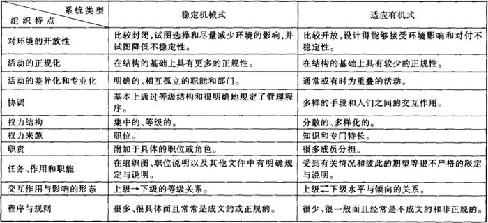 卡斯特和罗森茨韦克在其名著《组织与管理》中分析系统管理方法时所提出的一组概念。 有机式系统是指系统是相对灵活,能不断适应外部环境的变化。而机械式系统则是指系统是相对稳定,只适合于稳定的环境,不适合不断变化的环境。 有机式系统有利于非程序化决策、创新和多目标的实现,而机械式系统只适合于程序化决策、常规活动和单一目标的实现。 当出现下列情况时,以机械式组织为宜:(1)环境相对稳定和确定;(2)目标明确而持久;(3)技术相对统一而稳定;(4)按常规活动,生产率是主要目标;(5)决策可以程序化,从而协调和控制过程倾向于采用严密结构等级系统。 当出现下列情况时,以采用有机式组织形式为宜:(1)环境相对不稳定和不确定;(2)目标多样化并不断变化;(3)技术复杂和易变;(4)有许多非常规活动,在这些活动中创造性和革新性很重要;(5)使用探索式决策过程,而协调和控制常常出现相互调整,并且系统等级层次较少,具有较大的灵活性。 有机式与机械式系统对比如表2-3。 表2-3 机械式-有机式系统比较