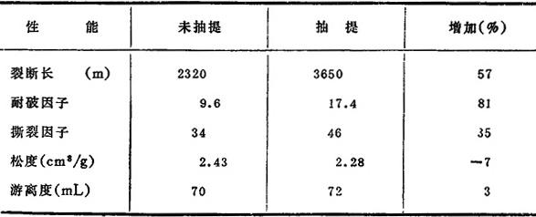 | 释义 | 有机溶剂抽提 在机械制浆过程中,木材结构受到高频脉冲的作用,直至分离出纤维,与此同时,树脂分也被游离出来而后又沉积在纤维表面,这些树脂起著封闭纤维表面反应基的作用,同时使纤维表面润滑,降低了水的表面张力,从而削弱了纤维间的结合力。 1966年Jon Brandal用丙酮抽提松木机械木浆,除去3.5%的抽出物,提高了纸的物理强度,如表7-6-4所示。 表7-6-4 丙酮抽提对松木机械木浆性质的影响