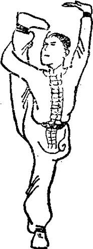 支撑腿直立站稳。另一腿用手经体侧上举,脚尖勾起,脚底朝上,高与头平。