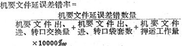 机要文件在处理、传递过程中,发生积压延误和差错的件数占机要文件出口、进口、转口交换量和袋套数及押运工作量总件数的比重。计算公式为: