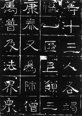【简介】: 西魏大统二年(546)十一月刻。正书。记两列共十三行,行七至十五字不等。上题名一列十三人;下题名两列,列十三行。右有记年一行,係从西魏《杜鲁淸妻等十八人造像》移刻于此。《杜贤明刻石》有数种,此爲其一。《中国书法大辞典》著录。 【赏析】:  《杜照贤等造像记》是以隷书爲主、杂以篆形草势楷法的“四不像”作品。其笔法或方或圆、或使转或直截、或挑翻或内擫,瘦劲随意,变化无端。所以,它给人一种放浪不拘、舒逸淸癯的感觉,也表现出有意悖离传统的怡然自得与杂乱无章,爲民间书法所特有的现象之一。从书法史迹来看,这种“四不像”的作品组合形式始于西汉简策字体,但后者是字体演变发展过程中日常用字的实际情况,此爲有意识的摹拟和工整化。 |