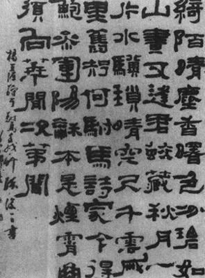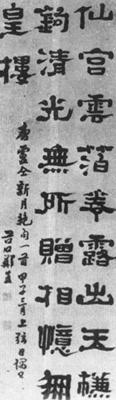 【赏析】: 郑谷口以善八分书,飮誉淸初书坛。《隷法琐言》云:“先生自言,,学者不可尙奇,初学隷,是学闽中宋比玉,见其奇而悦之。学二十年,日就支离,去古渐远。深悔从前不求原本,乃学汉碑,始知朴而自古;拙而自奇。沈酣其中者三十余年,溯流穷源,久而久之,自得眞古拙、趄奇怪之妙。,及至晚年,醇而后肆,其肆处是从困苦中来,非易得也。”《霋岳楼笔谈》云:“谷口分隷,在当时殊有重名,以汉石律之,知其未入古也。然笔较唐分则稍纵,故尙不伤雅。”观此幅“一、戚”等字,结体支离形象,乃知谷口深悔的苦味,留此宝鑒,良可贵也。其晚年书法,则飘逸虚灵,故《艺舟双楫》列其分书爲“逸品上”。   |