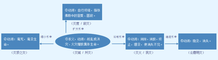 字源解说 烕,金文 = (戌,代表战乱)+ (火,代表火灾),表示兵灾与火灾对生命的集体性摧毁。当“烕”的“摧毁集体生命”本义消失后,篆文 在“戌” (兵灾)、“火” (火灾)基础上,再加“水” (洪灾),另造“滅”代替,表示洪灾、火灾等“天灾”与兵灾等“人祸”对生命的集体性摧毁。造字本义:战乱或洪灾、火灾摧毁全村或举家生命。俗体楷书 误将正体楷书字形 中的 的“戌 、火 ”组合,拆解成“戊 、一 、火 ”的组合,并省去“水” 和“戊” ,写成“火” 加“一” 的指事字 ,表示“火灾”摧毁生命。 附 文言版《説文解字》:滅,盡也。从水烕聲。 附 白话版《说文解字》:灭,全毁,无一幸存。字形采用“水”作边旁,“烕”作声旁。 引申线索