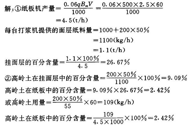 【例】 一台抄宽为2.5m的纸板机,以60m/min车速生产500g/m2的挂面纸板。每台面层浆打浆机载荷为1000kg纸浆和200kg高岭土,打浆周期为55min,高岭土在面层中的保留率为50%,计算:❶ 面层浆的百分含量(假设无纤维流失);❷ 在成品纸板中高岭土的百分含量。