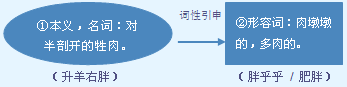 释义 | ![]() (人体)肥胖;脂肪多: 大~子|生了个~小子|现在~人越来越多了。 肥 féi ★ “胖”用于人。“肥”除了“肥胖、减肥瘦身”等的说法外还常用于动物。 人体脂肪多,肉多: ~乎乎的|近几年就怕~|发~日趋低龄化成了一个大问题。 瘦 shòu 消~|面黄肌~|他最近~了一点儿。 (人体)脂肪多,肉多。跟“瘦”相对。能重叠,可儿化,也常带上叠音后缀以表示程度的加深或喜爱等附加意义。 a.作定语。 结婚才一年,她便生了个~小子|杂耍场上,一个~礅礅(dūn)的中年男子正顶着大瓷坛,吆喝着招徕看客。 b.作谓语,可带补语。 他的身材~而不觉臃肿|这些贵妇人简直~得让人发愁。 c.作补语,常用“得”。 长得太~了|这小孩儿长得白生生、~乎乎的,真逗人爱。 【辨】 胖和肥:见“肥”。 【近】 肥 【反】 瘦 【注意】 又读pán,如:心广体胖。 字源解说 半,既是声旁也是形旁,表示解牛、剖牛。胖,篆文 ![]() ![]() ![]() 附 文言版《説文解字》:胖,半體肉也。一曰廣肉。从半,从肉,半亦聲。 附 白话版《说文解字》:胖,屠宰后对半剖开的牲肉。一种说法认为,“胖”是特别大块的肉。字形采用“半、肉”会义,“半”也作声旁。 引申线索 ![]() 【字族索引】 半 【同音字】 pán pàng |
