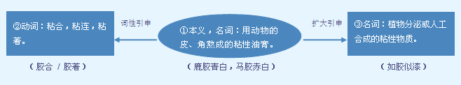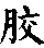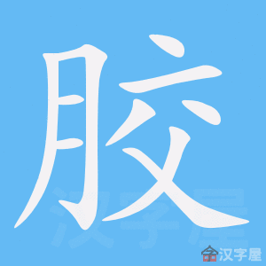 字源解说 交,既是声旁也是形旁,表示两者相连接。胶,甲骨文 = (夕,肉,膏脂)+ (交,两者相连接),表示可以将两个物体相粘合的粘性油膏。造字本义:可以粘合两个物体的粘性油膏,用兽皮熬制而成。篆文 以“肉” 代“夕,以 代“交” ,表示将羽饰粘连在衣帽上。俗体楷书 回归甲骨文字形。 附 文言版《説文解字》:膠,昵也。作之以皮。从肉,翏聲。 附 白话版《说文解字》:胶,黏性强的物质,用兽皮煮制而成。字形采用“肉(月)”作边旁,采用“翏”作声旁。 引申线索