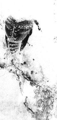 释义 | 枫鹰图 【作品赏析】: 此图以淡墨色卧笔横扫出一截枫树,横斜于画面;树干下部有一片红色枫叶,勾线填色,与枫树干前后虚实相衬。 树干上一只老鹰屹立,背朝观众,双翼隆起,头向前伸,似远眺又欲展翅飞翔。由于墨色对比,老鹰成了画面精神最凝聚处。 画家将传统花鸟画的勾填法和墨笔写意画法与竹内栖风等日本画家的画法揉合在一起,创立了一种新风格。鹰的羽毛刚中有柔,色泽鲜艳,身躯富于体积感和力量感。 他很重视写生,常跑到动物园画动物,画昆虫都经过严格的铅笔打稿。他对学生说:“很多人以为国画多是临摹的闭门造车之作,其实历代名家无不著重写生,所谓师法自然,累积经验,融会而达写‘意’之境界,所以写生是以实际结合理论,多细心观察自然,多加练习,对充实自己有莫大帮助”。高剑父提倡表现时代气息,故他画中敢于画电线杆、飞机、汽车等等。 。现代 高剑父 轴 纸本著色 纵168厘米 横78厘米 |
