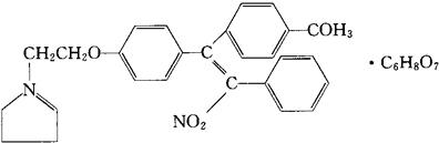 释义 | 枸橼酸硝米芬 C27H28N2O4·C6H8O7=636.65 CAS-5863-35-4 1-[2-[对-[α-(对-甲氧苯基)-β-硝基苯乙烯基]苯氧]乙基]吡咯烷枸橼酸盐(1∶1)。 1-[2-[p-[α(p-Methoxyphenyl)-β-nitrostyryl]phenoxy]ethyl]pyrrolidine citrate(1∶1). 抗雌激素药。 Nitromifene Citrate. USAN. |
