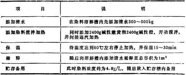 释义 | 染料溶液的制备 1.染料溶液的制备(表10—5—17) 表10—5—17 1—溶解槽 2—搅拌器 3—蒸汽夹套 4—放料口 5—排污口 这种溶解槽的容积较大,约为1.1m3,加热方式是间接蒸汽加热,搅拌器的转数为60r/min。 (2)型式二 一种染料溶解槽如图10—5—12所示。 1—溶解槽 2—搅拌器 3—直接通汽管 4—放料管 这种溶解槽的容积比型式一的小一些。 以上的两种溶解槽适用于染料液需要量较大的造纸厂,对于一般染料液需要量较小的造纸厂也可采用搪瓷桶或陶瓷缸用直接通汽进行溶解。 3.生产实例 某厂生产条纹牛皮纸,使用型式一的溶解槽,染料用量为碱性嫩黄0.12%,碱性橙0.12%,其生产实际操作如表10—5—18所示。 表10—518 |