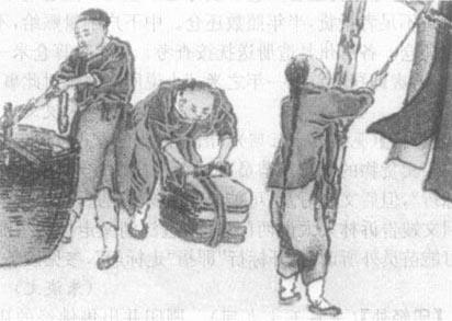 即染坊。 明代印染业已很发达,分工甚细,褚华《木棉谱》记:“染工有蓝坊,染天青、淡青、月下白;红坊,染大红、露桃红;漂坊,染黄糙为白;杂色坊,染黄绿黑紫,古铜、水墨、血牙、驼绒、虾青、佛面金等。其以灰粉渗胶矾涂作花样,随意染何色而后刮去灰粉,则白章烂然,名刮印花,或以木版刻作花卉、人物、禽兽,以布蒙板而砑之,用五色刷其砑处,华采如绘,名刷印花。”“有踹布坊,下置磨花石版为承取五色布,卷木轴上,上压大石如凹字形者,重可千斤,一人足踏其两端,往来施转运之则布质紧薄而有光。”沈云《盛湖杂录》记绍兴染绸情况:“绸之光彩,色泽鲜艳夺目者,全恃炼、染、踹、轴四项。数百年来皆为绍兴人专利之业。凡染绸之坊十余,炼坊三十余,踹轴等坊亦如之。 业此者约近千人。盖此等营业至劳苦,天未明植立水中漂洗,冰霜晨旦不避焉,故作业数日必休息,以回复其体力。”可知染坊工作甚苦,所以黄氏不愿投生屠户家和染衣行。  |