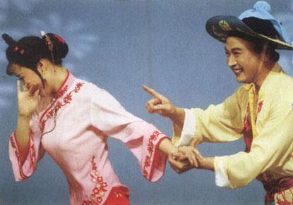 因主要伴奏乐器为柳琴(琴状狭长呈柳叶形),定名为柳琴戏。 柳琴戏形成于清代中叶以后,主要分布在江苏、山东、安徽、河南四省接壤地区。柳琴戏的来源有两种说法,一说是以鲁南民间小调为基础,受当地柳子戏的影响发展起来的;一说是由江苏海州传播而来。 柳琴戏的音乐唱腔非常别致,以多彩的花腔、独特的拖腔为主,地方特色尤为鲜明。男唱腔粗犷、爽朗、嘹亮。女唱腔婉转悠扬、丰富多彩、余味无穷。演唱者可以随心所欲地发挥、创造,自由地变化。此外,在唱腔的落音处,女腔常用小嗓子翻高八度,男腔加入衬词拖后腔,也是其独特风格。 柳琴戏的表演粗犷朴实,节奏明快,乡土气息浓厚,演员的身段、步法明显带有民间歌舞的特点。 柳琴戏唱词通俗生动,善于铺陈,尤其长于叙事和表现人物的心理活动。 柳琴戏的剧目多取材于历史故事和民间传说,表演朴实、生活化。  柳琴戏《走娘家》 |