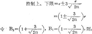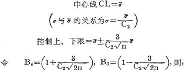 释义 | 标准差控制图 指根据样本的标准差(σ)加减其相应的3个标准误 样本标准差的分布,在大样本条件下(n>30)接近于正态分布。样本量愈小,样本标准差呈偏倚状态,曲线愈不对称。 中心线CL=σ 若已知σ,则: 控制上、下限=B2σ和B1σ 若总体标准差为未知,已知样本标准差的平均数( B1、B2、B3和B4数值根据样本容量(n)可查表取得。 |