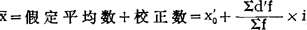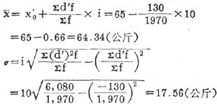 在算术平均数据简捷法的基础上,进一步求均方差。其步骤如下:(1)将资料编成组距数列;(2)选定接近平均数的一组的组中值为假定平均;(3)定各组中值(X')对假定平均数的组距差,,i代表组距;(4)以各组次数乘其组距差(d')得(d'f);(5)求f、(d')f、(d')f三者之各;(6)求平均数,;(7)代入公式求标准差σ,