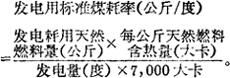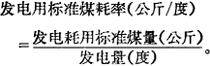 是电力工业中反映单位发电量或单位供热量平均燃料消耗量的技术经济指标。 它分为发电用标准煤耗率和供热用标准煤耗率。发电用标准煤耗率,是指火力发电厂每发一度电平均耗用的标准煤量(单位:公斤/度)。 其计算公式如下:  标准煤是指每公斤含热量7,000大卡的煤。 实际所用的天然燃料,如超过或低于这一标准,都应按此标准进行换算,换算的公式如下:  由天然燃料直接计算发电用标准煤耗率的公式如下:  供热用标准煤耗率,是指热电厂供热每百万大卡平均耗用的标准煤量(单位:公斤/百万大卡)。 其计算公式如下: