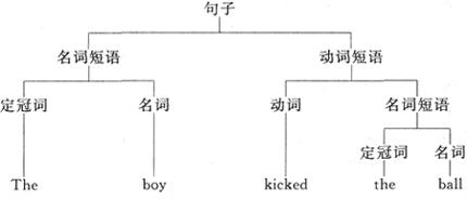 表示句子中各语言单位及其关系的一种图示方式。 利用树形图分析句子时,可将句子划分为不同的短语,再将短语划分为单词,从而清楚地显示句子中各个成分之间的关系。如句子“Theboykickedtheball”(男孩踢球),可用树形图表示出来(如图)。 从图中可以看出,这个句子是由一个名词短语(Theboy)和一个动词短语(kickedtheball)组成的。其中,名词短语由一个定冠词(The)和一个名词(boy)组成;动词短语则由一个动词(kicked)和另一个名词短语(theball)组成;这个名词短语又可以进一步划分为一个定冠词(the)和一个名词(ball)。 建立树形图的规则是“短语结构语法”。乔姆斯基认为,短语结构语法由一系列重写规则构成,根据这些规则可生成语言中所有句子。根据规则产生树形图的过程叫做推导过程。如生成上面句子的重写规则包括以下几条:(1)S(句子)→NP(名词短语)+VP(动词短语);(2)NP→D(限定词)+N(名词);(3)VP→V(动词)+NP;(4)N→boy,ball;(5)V→kicked;(6)D→the。树形图也能用来表示在问题解决过程中一系列的可能操作以及这些操作导致的各种状态,从而描述相应的问题空间。