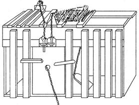 美国心理学家桑代克研究动物学习过程即解决问题过程的实验装置。 将饥饿的动物放入箱内,观察动物如何打开箱子的门栓以逃出迷箱,获取箱外的食物。打开门栓的方式因迷箱装置不同而有多种,如按压杠杆或拉动绳线。在一典型的实验中所用装置如图。绳子一端与箱子内的踏板相连,另一端连著门栓。 动物只要按压踏板,则门就打开。记下动物逃出迷箱所用时间及其行为表现,再将动物放回箱内,进行下一次尝试。 多次实验直至最后动物能准确、快速地按压踏板逃出迷箱。根据应用这类实验装置进行的实验,桑代克提出了学习的联结理论及有关的学习律,并认为学习是一个不断尝试、逐步减少错误的过程。