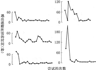 美国心理学家桑代克为研究动物的学习即问题解决过程而进行的实验。 在一典型的实验中,将一只饿猫放入迷箱中,猫可从箱内看到箱外的食物。为逃出迷箱、获取箱外食物,猫必须学会触动箱内的某种特殊装置,如按压踏板或拉动绳线,使箱门打开。猫最初在箱内表现出乱跳、撕咬栏杆、碰撞箱壁等盲目、尝试性的无关动作,偶尔碰到踏板或拉动绳子而打开箱门,得到箱外食物。通过多次反复实验,动物逐步减少了盲目、随机、无效的动作,最后一被放入箱内即能很快触动装置把门打开。 桑代克记录下每次实验中猫逃出迷箱所用的时间,即猫作出正确反应的潜伏期。如以纵轴表示成功反应所需的时间,横轴表示连续尝试的次数(即实验次数),则可得到学习曲线(见图)。 依据实验结果,桑代克认为动物的学习是一个渐进的、盲目尝试而逐步减少错误的过程,是建立情境(迷箱的内部结构)与正确反应(压踏板或拉绳而开门)之间的联结过程。他由此提出了学习的联结理论。