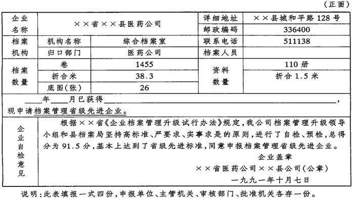 【简介】: 档案管理升级是档案管理水平考评中的一个重要环节。档案管理升级登记表是反映升级考评过程、记载考评结果的凭证性专用文件。档案管理升级登记表是证明被考评单位档案管理水平的依据和凭证。档案管理升级登记表的种类:以性质划分,可分为两大类:一类是档案馆、机关档案室档案管理升级登记表(档案管理升级标准分四个等级,即省特级、一级、二级、三级先进档案管理),另一类是企业档案管理升级登记表(档案管理升级标准分为三个等级,即国家一级、国家二级、省级先进档案管理)。档案馆、机关档案室档案管理升级登记表的内容一般分为三部分:第一部分是申报单位的基本情况,包括单位名称、详细地址、邮政编码、档案管理机构名称、档案人员姓名、档案资料(文书档案〔卷〕,科技档案〔卷〕,其它专门档案〔册、盒〕,资料〔册〕,合计卷〔册、盒〕);第二部分是申报部分,包括申请理由、单位自检意见、主管单位审查意见;第三部分是考评部分,包括考核评定意见、审核意见、审批意见。企业档案管理升级登记表的内容也由三部分组成:第一部分也是申报单位的基本情况,其中除档案数量(卷、折合米、底图〔张〕),资料数量(册、折合米)等内容略有不同外,其它内容都与档案馆、机关档案室类大同小异;第二、三两部分内容,与档案馆、机关档案室档案管理升级登记表相同。档案管理升级登记表一式四份,分别由申报单位、主管机关、审核部门、批准机关留存。 【范例】: 档案馆、机关档案室档案管理升级登记表