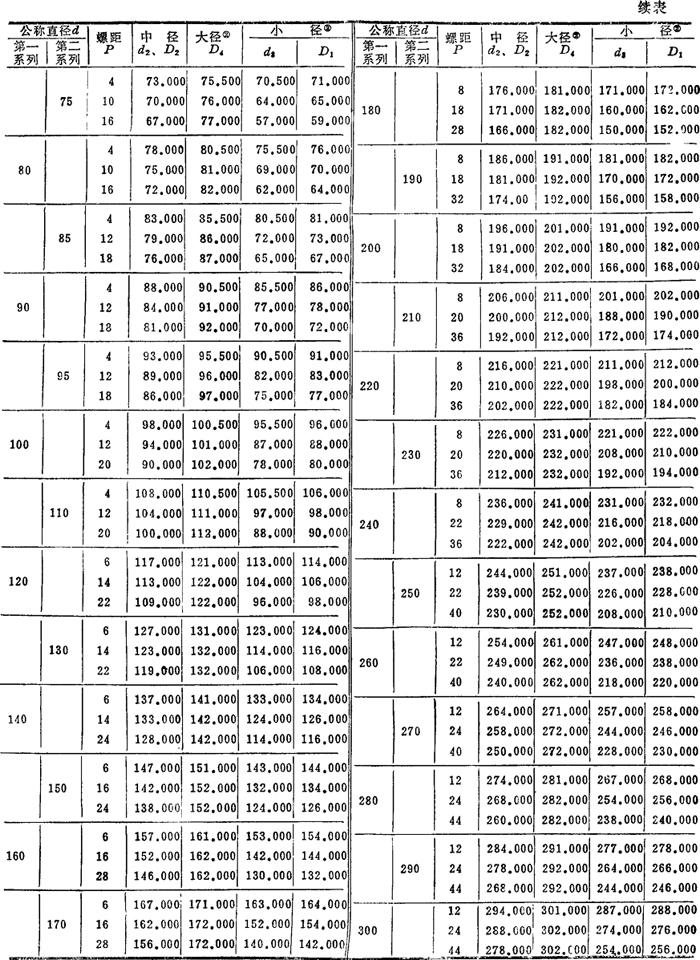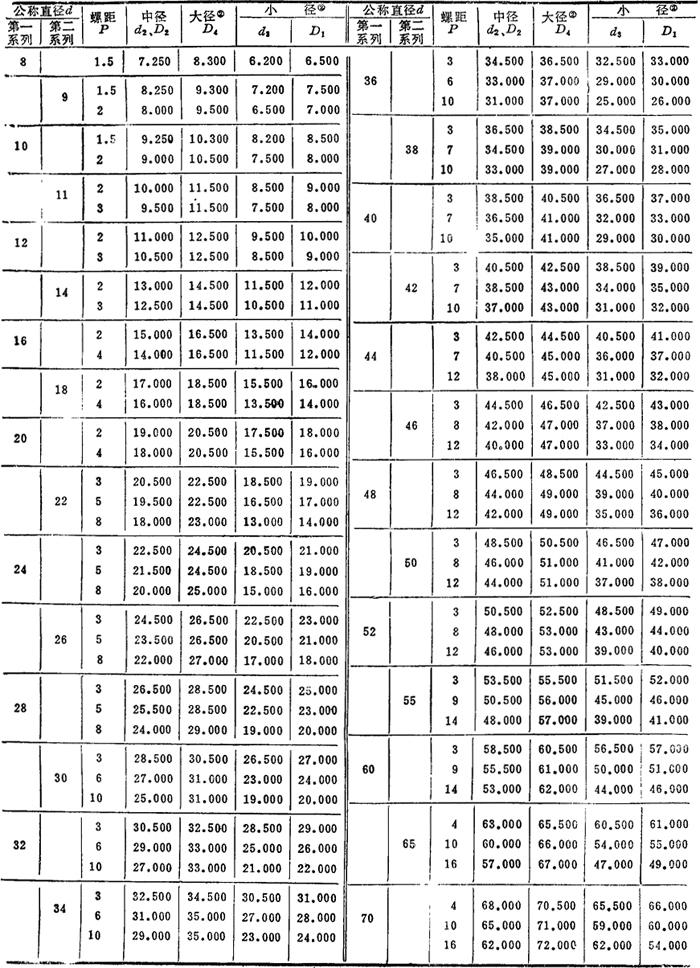 释义 | 梯形螺纹 21.1 梯形螺纹的牙型及尺寸(摘自GB5796.1—86) 梯形螺纹的基本牙型如图4.1-4所示。其尺寸关系:H=1.866P;H1=0.5P。计算时取小数点后三位。梯形螺纹的基本尺寸见表4.1-23,其中外螺纹小径 D、d—内、外螺纹大径(公称直径);D1d—内螺纹小径;D2、d2—内、外螺纹中径;P—螺距;H—原始三角形高度;H1—基本牙型高度 表4.1-23 梯形螺纹的基本尺寸(摘自GB5796.3—86) mm 注: ❷ D4为内螺纹大径基本尺寸,d3为外螺纹小径基本尺寸。 21.2 梯形螺纹标记示例 ❶ 梯形螺纹副:Tr40×14(P7)LH-7H/7h-L 梯形螺纹(Tr),公称直径40mm,导程14mm,螺距7mm(如单线则只标螺距),LH表示为左旋螺纹(不标为右旋),螺纹副的内螺纹公差带为7H,外螺纹公差带为7h,L表示为长旋合长标为中等旋合长度N组),特殊需要时可直接标出旋合长度数值(mm)。 ❷ 梯形外螺纹:Tr40×7—7e 梯形外螺纹(Tr),公称直径40mm,螺距7mm,右旋,公差带为7e,中等旋合长度。 |