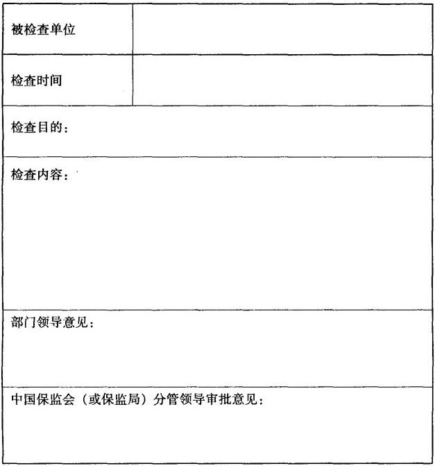 释义 | 检查档案整理阶段 第二十六条 在保险统计现场检查过程中,检查组应当及时整理现场检查情况档案。档案包括:现场检查立项申请表、部署检查的文件、现场检查通知书、检查方案、会谈记录、工作底稿、证明材料、检查情况、被检查单位的书面反馈意见、检查报告、以及记录反映检查过程和检查结果的文件及数据资料、检查意见书、行政处罚事先告知书和行政处罚决定书、被检查单位执行处理决定的报告等。 第二十七条 归档的案卷应当编写案卷目录,卷内材料目录、案卷目录一律用统一格式打印,卷内文件资料目录应当放在卷首,检查档案整理完毕后,制作保险统计现场检查档案封面(格式详见附件10),封装成册,按档案管理的有关规定妥善保管。 附件:1、保险统计现场检查立项申请表; 2、保险统计现场检查方案; 3、保险统计现场检查通知书; 4、保险统计现场检查进场会谈记录; 5、保险统计现场检查资料调阅清单; 6、保险统计现场检查工作底稿; 7、保险统计现场检查情况; 8、保险统计现场检查报告; 9、保险统计现场检查意见书; 10、中国保监会(××保监局)保险统计现场检查档案。 附件 保险统计现场检查立项申请表 200×年××月××日 附件2:保险统计现场检查方案 一、被检查单位 被检查单位名称: 被检查单位负责人: 二、检查目的 三、检查依据 (一)《××××××》(××××[××××]×××号); (二)《××××××》(××××[××××]×××号); (三)《××××××》(××××[××××]×××号)。 四、检查内容 本次检查主要针对××保险机构××××年××月××日至××××年××月××日的保险统计工作,必要时可上溯或后延。 检查内容包括: (一)××××××××××××××; (二)×××××××××××; (三)×××××××××××。 五、检查安排 (一)人员组成及分工 检查组由××人组成,×××同志担任检查组组长,×××同志为检查组主查人,×××、×××同志为检查组成员。 具体分工如下: (二)进度安排 ××××年××月××日,检查组人员集中培训; ××××年××月××日,发出《保险统计现场检查通知书》; ××××年××月××日,进入现场听取自查汇报、举行进场会谈,调阅资料; ××××年××月××日至××××年××月××日至,现场检查及处理。 附件 保险统计现场检查通知书 ( )号 __: 兹指派下列人员于 年 月 日起,对你单位进行现场检查,检查期暂定为天,即从 年 月 日至 年 月 日,检查范围和内容主要是“ ” 请予积极配合,做好有关资料的准备,并提供必要的工作条件。 检查组组长: 主查人: 检查组成员: 特此通知 (检查单位公章) 年 月 日 附件4:保险统计现场检查进场会谈记录 附件5:保险统计现场检查资料调阅清单 被检查单位: 附件6:保险统计现场检查工作底稿 编号: 被检查单位名称: 检查日期: 检查人员: 检查内容及情况: 评价或结论: 复核人员及复核意见: 附件7:保险统计现场检查情况 ___:: 本次现场检查的主要问题如下: 请你单位于 年 月 日前将有关书面意见返回检查组。 主查人: 年 月 日 检查组组长: 年 月 日 被检查单位意见: 年 月 日 附件8: 密级:机密 编号:保险统计现场检查报告 被查单位名称__ 被查单位负责人__ 监管单位名称__ 监管单位负责人:__ 检查组组长:____ 检查组主查人:____ 检查项目:____ 检查日期:____ 报告完成日期:____ 本检查报告是由中国保险监督管理委员会监管人员依据《中华人民共和国保险法》、《中华人民共和国统计法》、《保险统计管理暂行规定》等法律、法规和规章对被查单位实施现场检查后形成。资料来源于被检查单位所提供的业务、财务信息及有关档案。本报告必须严格保密。 保险统计现场检查报告目录 一、保险统计现场检查工作基本情况 二、被检查单位保险统计工作基本情况及总体评价 三、检查中发现的问题 四、处理意见 一、保险统计现场检查工作基本情况 根据××××的工作部署,依据《中华人民共和国保险法》、《保险统计管理暂行规定》等法律、规章及规范性文件,中国保监会(××保监局)检查组于××年××月××日至××年××月××日对××保险公司(××分公司/××支公司)的保险统计工作(或××××××问题)进行全面现场检查,检查的重点是××××××,检查期为××年××月××日至××年××月××日。检查组组长为×××,主查人为×××,检查组成员有×××、×××、×××。 检查组根据本次现场检查的目的、内容和要求,制定了《保险统计现场检查方案》。按照《中国保监会保险统计现场检查工作规程》的程序和要求,检查组对××保险公司(××分公司/××支公司)的保险统计现场检查采取了进场会谈、现场审核报表数据、查看历史数据资料、调查取证、座谈询问等方式。 检查结束后,检查组进行了情况汇总,形成了《保险统计现场检查情况》,于××年××月××日印发给××保险公司(××分公司/××支公司)。××年××月××日检查组与××××保险公司负责人进行了现场检查的总结会谈,向该公司通报了现场检查情况。本检查报告建立在《保险统计现场检查情况》的基础上,并参考了该公司反馈的合理意见。 (该公司对检查组工作支持配合情况的简单说明××××。) 二、被检查单位保险统计工作基本情况及总体评价 (一)被检查单位基本情况 …… (二)对被检查单位保险统计工作的总体评价 …… 注:总体评价范围因检查内容的不同而不同。 三、检查中发现的问题 (一)