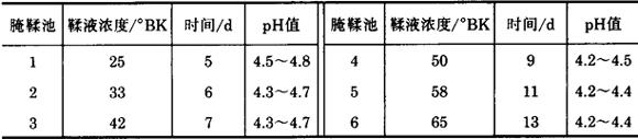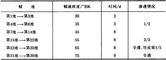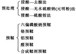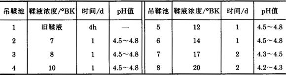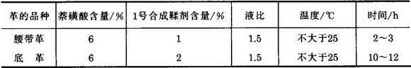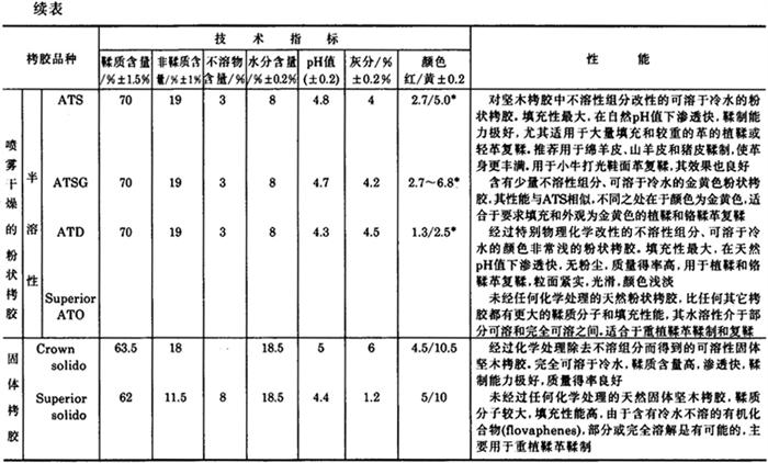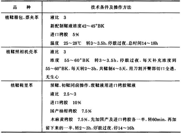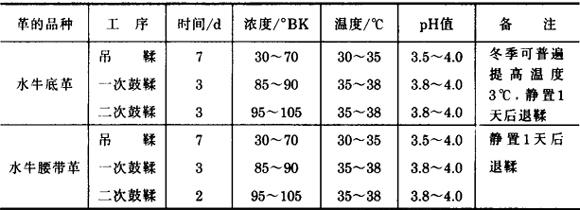 释义 | 植物鞣法 用植物鞣剂处理水洗或脱灰的裸皮,使之变成植物鞣革的操作方法称为植物鞣法。 用植物鞣法制成的重革有鞋底革(外底革和内底革)、工业用革(如轮带革)、装具革、箱包革等。对鞋底革性能要求是颜色均匀浅淡,革身丰满、坚实而有弹性,延伸性小,成型性好,耐磨性较高,吸水性小,透气性和透水汽性良好,水溶物宜少,鞣制系数高,有足够的耐湿热稳定性和抗霉性。 (一)植物鞣质和植物鞣料及植物鞣剂 1.植物鞣质 含在某些植物的根、茎、叶、皮、木、果实和果壳的组织细胞中,可溶于水、味涩,能与裸皮作用并使之成革的物质称为植物鞣质,也称为单宁。 2.植物鞣剂的组成 含有较丰富的植物鞣质,能满足栲胶生产要求的植物性原料,称为植物鞣料。我国含有植物鞣质的植物约有300种,其中可利用来做栲胶原料的有20多种。植物鞣料经浸提、净化、浓缩等过程制成的固体物质(粉状、粒状或块状)或膏状物称为植物鞣剂或鞣料浸膏,商业上通称栲胶。植物鞣剂的组成如下: 注:可溶性粉状坚木栲胶:在18℃水中完全溶解。 半溶性粉状坚木栲胶:在18℃水中部分溶解。 固体坚木栲胶浓度为80%,冷却时固化。 *过滤不溶物后溶液的颜色。 表2-40 常用栲胶的性质 (二)植物鞣法 1.传统池鞣法 池鞣法生产重革的工艺流程是: 吊鞣→腌鞣或平鞣→热鞣→退鞣 以黄牛底革鞣制工艺为例加以说明。 (1)吊鞣:将水洗或表面脱灰碱的裸皮逐张悬挂在吊鞣池的鞣液中,悬挂裸皮的绳索拴在池子边缘的桩上。吊鞣的第一池的鞣液为旧鞣液,浓度淡,鞣质含量2~4g/L。旧鞣液将未脱灰的裸皮或表面脱灰的裸皮进行脱灰作用。值得注意的是防止皮互相接触,否则鞣液不能渗透到接触了的部位,结果形成白花。 吊鞣池液比 9 吊鞣池温度 15~20℃ 吊鞣池数 8 时间 9天 操作顺序 另外,裸皮也可以挂在可振荡的框架上,这种框架可以很慢地振荡,防止引起白花和产生较均匀和较快的鞣制作用。悬挂皮的框架可以用行车提起来,从一个池子放入另一个池子中。 吊鞣池组中每个池子彼此都是由地下的管子互相连通的,使得鞣液能够流动,借鞣液压力从一个池子的底部流到下一个池子的顶部。高浓度的鞣性强的鞣液总是取代低浓度的鞣性弱的鞣液。这组鞣液是由平鞣池来的。水洗或表面脱灰的裸皮从低浓度的鞣性弱的鞣池中向高浓度的鞣性强的鞣池逐渐移动。 (2)腌鞣:将吊鞣革层层平铺在鞣池内,革与革之间撒上切细的树皮鞣料或橡椀鞣料,并在池内注入浓度较高的鞣液将革淹没的鞣制方法改为腌鞣,腌鞣时间一般为50天左右。 液比 2 腌鞣池数 6 温度 15~20℃ 时间 51天 操作顺序 如果将吊鞣革逐张平铺于腌鞣池内,较高浓度的鞣液中,而不在革与革之间撒上切细的树皮或粉碎的鞣料的鞣制方法,称为平鞣或卧鞣。重革鞣制也可以经吊鞣后平鞣再热鞣。平鞣或卧鞣时间约20天。 (3)热鞣:将腌鞣革逐张平铺于热鞣池内的高浓度和较高温度的鞣液内浸泡。 液比 2 鞣池数 勿需移池 温度 40~45℃ 时间 22天 鞣液浓度 75~100°BK pH值 4~3.8 (4)退鞣:热鞣后的革要经过退鞣将革内过量的鞣质以及非鞣质除去,以免造成植物鞣革的反栲、反色、发花、裂面等缺点。 退鞣的方法是将热鞣过的革浸入淡鞣池内。一般需要经过两天,第一天浸入10°BK鞣液中,第二天则浸入更淡的鞣液(2~5°BK)内。退鞣以后就进入鞣后湿处理。 (5)鞣液的流动顺序 新配鞣液(凝缩类栲胶70%~80%,水解类栲胶20%~30%)→热鞣池→腌鞣池或平鞣池→吊鞣池→排弃。 由于此法劳动强度大,鞣制周期长,排放废液污染大,目前已很少使用。 2.池鼓结合鞣法 池鼓结合鞣是对传统池鞣法的改进,其工艺流程是: 吊鞣→平鞣→挤水→静置→鼓鞣→静置→挤水→称重→干复鞣→热鞣→静置→退鞣→静置 (1)水牛外底革 ❶ 吊鞣 吊鞣池数 8 时间 9天 温度 20~25℃ 浓度 头池 9°BK 尾池 14°BK 纯度 20%~25% 50% pH值 5.4 4.3 头池(第一池)用硫酸调节pH值,第二池用硫酸和醋酸调节pH值,尾池用萘磺酸调节pH值。每下降pH值0.2,需用硫酸1kg,醋酸11.3kg。 在吊鞣过程中鞣液的pH值由高到低,浓度和纯度及温度由低到高,鞣液动,皮不动,池号变。摇架多荡动,皮每天换鞣液。 ❷ 平鞣 平鞣池数 40 时间 39天 液比 1.8 pH值 4.4~3.8 浓度 60%以上 纯度 50%~60% 温度 第1池至第6池不加温 第7池至第14池25℃ 第15池至第22池30℃ 第23池至第39池35℃ 操作顺序 操作方法:皮不动,池号变,液动。 ❸ 鼓鞣 浓度 85~90°BK 液比 3~4 pH值 ≤3.6 温度 42~45℃(夏天42℃,冬天45℃) 时间 连续转动48h(转鼓转速7r/min),白天正转,夜间反转。如果鞣液浓度达不到要求,加坚木栲胶增加浓度,因坚木栲胶不产生沉淀。pH值必须控制在3.6以下,如果高于此值,可以加入NF合成鞣剂调节。 ❹ 干复鞣 浓度 140°BK 鞣液用量 10% NF合成鞣剂 2.5% 时间:上午转80min,下午转70min ❺ 热鞣 浓度 95°BK以上 液比 2~2.5 pH值 头池4.2 尾池3.6 时间 7天 操作顺序 每天拉革1次,加温1次,两天换液。 ❻ 退鞣 液动,皮动,池号不变,退鞣结束检查退鞣革粒面和肉面比较清晰。退鞣不够,容易引起反栲。退鞣结束后出池静置1天。 此法用于外底革生产,质量好,但生产周期较长,操作较繁琐,劳动强度较大,加上外底革几乎已被橡胶和塑料材料代替,因此,此法很少使用。目前较为广泛采用的池鼓结合鞣法是脱灰裸皮预处理,吊鞣,鼓鞣,退鞣,用于内底革、腰带革等生产。 (2)水牛内底革和