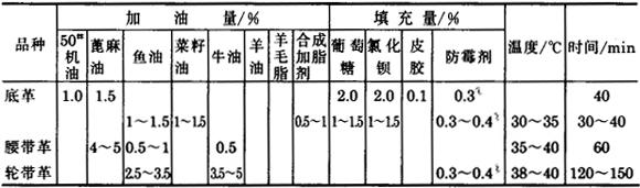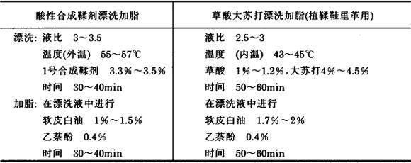 释义 | 植物鞣革的鞣后湿处理 (一)植物鞣重革 1.植物鞣重革的鞣后湿处理工艺流程 称重→退鞣或水洗→漂洗→挤水→称重→加油填充→伸展 2.退鞣或水洗 (1)退鞣或水洗的目的 植鞣重革在鞣制的最后阶段都用高浓度植物鞣液鞣制,所以在革内含有较大量的多余鞣质和非鞣质,如不适当除去,在干燥过程中,革中非结合鞣质和非鞣质随水分的汽化而被带至粒面上来,经与空气接触而被氧化,颜色变黑,产生反栲,干后革被弯曲时在严重反栲处发生炸面。如果把大部分的非结合鞣质洗去,可避免反栲,因此植物鞣过的革必须经过退鞣,适当除去一部分非结合鞣质。但水溶物太少时,革就发软,故保持15%~20%的水溶物,以填充革的内部,使革坚实是必要的。 (2)植鞣重革退鞣方法: 如用两个池子退鞣,第2池pH值调低到3.2~3.5,每天比用3池多捞倒一次。成革也比三池退鞣的革坚实些。 最后一个退鞣池的pH值主要用1号合成鞣剂,加以少量甲酸或醋酸调整。每天把最浓的退鞣液一部分用泵抽走,供配制吊鞣的头池,不足量用第2池的退鞣液补足,第2池则用第3池的最稀退鞣液补足,第3池内补足温水,调好pH值。同时退鞣的革逐次向浓度低的退鞣池转移,空出的第1池放入要退鞣的植物鞣革,开始新的一轮退鞣。 退鞣1.5~2天后,可以在转鼓内以约35℃、10°BK的鞣液300%~350%(按植物鞣革实重计)转30min,代替最后一天的池退鞣。 上述退鞣法适合于传统池鞣法和池鼓结合鞣法鞣制出来的植物鞣革的退鞣。 快速植物鞣革通常采用温水闷水洗10~15min,然后漂洗。 3.漂洗 (1)漂洗的目的 溶解革表面层沉积物,也使鞣质的颜色变浅,从而使植鞣革颜色浅淡,均匀一致。 (2)漂洗方法 主要采用酸性较强的辅助型合成鞣剂〔如1号合成鞣剂(NF合成鞣剂)〕,最好添加少量草酸,使用转鼓漂洗较为普通。具体操作方法如下: 液比 2.5~3 1号合成鞣剂 1%~2% 草酸 0.2%~0.3% 温度 45~50℃ 转10~15min,而后挤水,加油填充,伸展,挂晾干燥。 在漂洗时也可加入少量甲醛(如0.2%)起固定鞣质作用,避免反栲。 4.加油和填充 (1)加油填充的目的 由于底革要求紧实、厚硬而有弹性,所以一般加油量不大,底革加油的目的是,使革具有丰满性和弹性,提高抗张强度,降低吸水性,表面施油可防止反栲,粒面施油后革滚压或打光后更加光滑。传送带革(轮带革)和装具革要求抗张强度大,伸长率小,柔韧性好,因此,加油量比底革多。 底革加油时或加油前后加入一些填充剂以增加成革的质量,还能把革内的非结合鞣质固定在革内,使革干燥时非结合的鞣质不致渗到粒面而造成反栲。使革有吸水性,在干燥的天气中,保持皮革一定的湿度,以增高其耐磨性,并避免因过干而裂面。 (2)加油填充方法 重革加油填充 重革加油常用蓖麻油、鱼油、矿物油、菜籽油、豆油、牛油、羊毛脂、羊油等的混合油脂。矿物油渗透性强,能促进其它油脂一起渗透入革内,并保护油脂不受氧化和皂化,但用量不宜过大,一般为总油脂量的20%~40%,而且相对密度应不低于0.0875,并不含游离酸。 重革加油时也常加入防霉剂(如乙萘酚0.3%~0.4%、对硝基酚0.1%~0.2%、五氯酚钠0.3%),通常将油脂加热到60℃左右,慢慢撒入防霉剂,搅拌均匀后再加入其它油脂搅匀使用。 底革加油时通常加入填充剂,如葡萄糖、氯化钡、硫酸镁、皮胶、明矾等。腰带革、轮带革加油时不加填充剂。 重革加油通常在热风转鼓中进行,在转动情况下从轴孔将油脂混合物加入,或者将油脂混合物涂于革的粒面,再放入转鼓内,并将完成涂油后剩余的油脂混合物倒入转鼓内,开动转鼓,使油脂渗入革内。 表2-50 注: ❷ 乙萘酚。 重革加油填充技术条件 (二)植鞣轻革 植鞣轻革的品种有植鞣箱包革、植鞣票夹革,植鞣鞋里革、植鞣照相机壳革等。以植鞣猪皮轻革工艺为例加以说明。 1.植鞣轻革的鞣后湿处理工艺流程 称重→漂洗→加脂→搭马静置→滚木屑削匀→漂洗→搭马静置 (1)植鞣箱包、票夹革 称重→染色→水洗→甩水→滚松→干加油→堆置→伸展→挂晾干燥 (2)植鞣照相机壳革 挤水→称重→加油→伸展→挂晾干燥 (3)植鞣衬里革 称重→加油→贴板干燥→挂晾干燥 2.鞣后湿处理方法 (1)漂洗前湿处理 ❶ 称重:作为以下工序用料依据 ❷ 漂洗加脂 表2-51 漂洗加脂 注意事项:漂洗时防止漂花、沾污等毛病。 加脂时乙萘酚必须全部溶解好,软皮白油必须用5~6倍热水稀释,从轴孔加入,加脂后不得有油滑感。 ❸ 搭马静置:要求铺平,不得有折皱 ❹ 滚木屑削匀: 植鞣猪皮箱包革 1.8~2.0mm(双层) 植鞣猪皮票夹革 1.4~1.5mm 植鞣猪皮鞋里革 不削匀 植鞣猪皮照相机壳革 不削匀 ❺ 漂洗:在第一次漂洗液中进行,再加1号合成鞣剂0.3%~0.5%,转20~30min ❻ 搭马:搭马静置一夜 以下工序分别按品种进行: (2)漂洗后湿处理 ❶ 植鞣猪皮箱包革、票夹革 称重:作为以下工序用料依据 染色:液比 1.5~1.8 温度(外温) 55~58℃(不得超过65℃) 染料:碱性染料配方另订 时间:20~25min 水洗:闷水洗1~2次,每次约10min 甩水:机器甩水,甩到革对折手捏有水珠 滚松:转30~40min 干加油:混合油 2.5%~3%,转60~90min 混合油配方(Ⅰ):菜油50%,1~5号机油50% (Ⅱ):鱼油40%,1~5号机油60% 堆置:按品种搭平,堆放整齐 伸展:机器伸展必须伸开、伸平,不得有皱印 挂晾干燥:干燥至水分含量45%~50% ❷ 植鞣猪皮照相机壳革 挤水:机器挤水 称重:作为以下工序用料依据。 加油:混合油 4%~4.5%,转40~60min,要求加油均匀,不得产生油斑。 伸