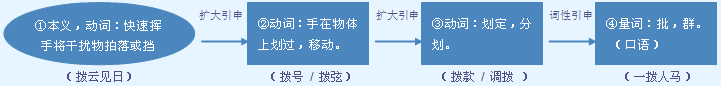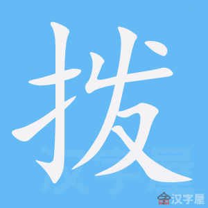 释义 | ![]() ❶手脚或棍棒等横着用力,使东西移动。可重叠。常作带宾、带补谓语。 ~电话号码|往回~指针|用针~刺儿|你再~~灯捻儿|钟~得太慢了|~不动|~错了|把门~开了|把门闩~过去|~了半天才把刺~出来|把长针~了两圈|~过几次了|把时间~到12点|把盘子里的菜~给奶奶|~下来两个算盘珠儿|别来回乱~|顺着时针方向~。 ❷分出一部分发给;调配。可作带宾、带补谓语。 ~救济款|~一千吨大米支援灾区|~两个人到锻工车间工作|钱~少了|多~点儿|救济物资~给灾区|科研经费已~过一次了|~下来一笔经费|~不了这么多钱|~过几个同学去|这笔钱往哪儿~? 带上“儿”或“子”,用于人的分组;伙。常与数词构成数量词组作相应的成分,也可单独用。 a.作宾语。 工人们分成两~儿干活|大家轮着~儿休息。 b.作定语。 刚才有一~子队伍从这里开过去了。 【词语】 拨付 拨工 拨拉 拨云见日 字源解说 拨,篆文 ![]() ![]() ![]() ![]() ![]() ![]() ![]() ![]() 附 文言版《説文解字》:撥,治也。从手發聲。 附 白话版《说文解字》:拨,治理。字形采用“手”作边旁,采用“發”作声旁。 引申线索 ![]() 【字族索引】 发 【同音字】 bō |