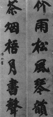 释义 | 楷书六言联 【简介】: 淸·传山书。纸本。楷书。六言联一则,款三字,共十五字。刊于《历代楹联名迹》。 【赏析】: 明末淸初的书坛是属于帖学走向衰败的年代,由于社会上以浮飘、流滑的书风爲时尙,而使书法走上了靡弱的道路。所以,傅山处于这种环境下,对这种书风越来越反感。他凭著自己的学识和思想,很快对这种书风予以批判,使他成爲明末淸初的重要书法家。与靡弱的书风相反,傅山强调的是书法的骨力和气魄,这就很自然地使他锺情于颜眞卿的书法了。他评颜眞卿的书法道:“作字如作人,亦恶带奴貌。试看鲁公书,心画自孤傲。”傅山从作字如作人的人本精神出发,特别追求书法艺术的人格意义。这幅楷书对联就是深受颜眞卿影响的一件代表作。细看此幅作品,运笔重拙,藏头护尾,涩笔而行,故而线条粗壮雄浑,结体亦方整、朴茂、端庄、开张。因此,整幅对联一反赵孟頫、董其昌的婉约、秀丽,而与当时的书坛表示了格格不入的异端情緖。这也就是爲什么傅山评董其昌的书法,蔑视其爲“止是一个秀字”的原因了。这旣是傅山的书学观,也是明末淸初的书法异端思潮中的主力,理解了这一点,我们就可以知道,傅山书学颜字所有的时代价値。尽管从这幅对联来看,也不完全是颜书,更揉合了一点宋人书法的意趣,但对书法精神的理解完全是从颜眞卿那裏来的。 |
