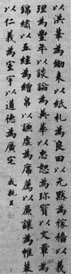 释义 | 楷书立轴 【简介】: 淸·永瑆书。纸本。楷书。凡四行,共七十五字。刊于日本《明淸书道图说》。 【赏析】: 此成亲王楷书立轴,最能代表其楷书风格,尤得欧阳询法。笔力遒劲瘦硬,其下笔之势,出规入矩,洒落超然,帝王之气槪,皆蕴藉于笔墨之中。总之,通观此书轴,其字笔致流丽,书体典雅,古韵浓郁,又有新意。由于他天资高又加以好学,因而功力深到,自然神化而精奥。与刘墉、翁方纲、铁保并称淸中期四大书法家。当时士大夫得其片纸只字,重若珍宝,至今其墨迹仍颇爲世人所珍视。 |